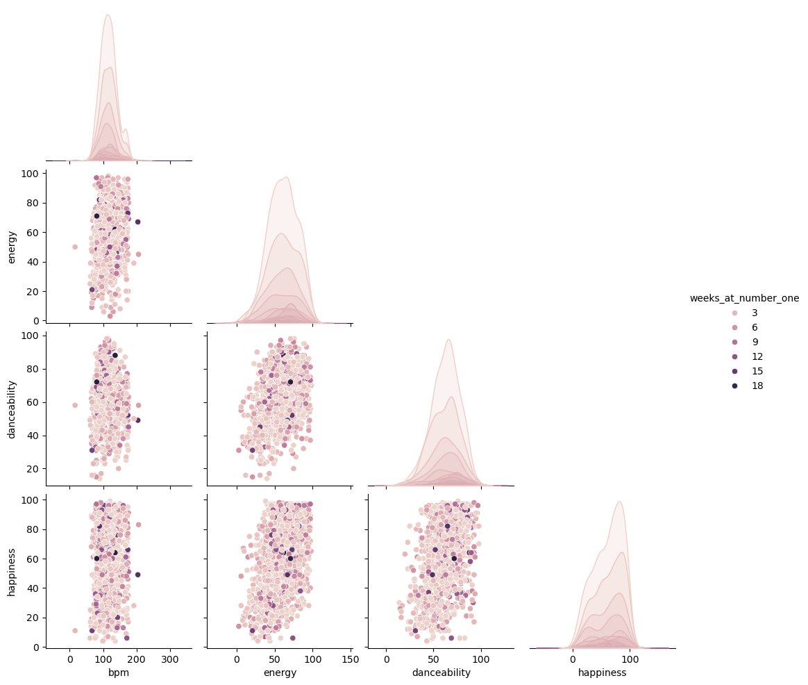 sns.pairplot(billboard[['bpm', 'energy','danceability', 'happiness','weeks_at_number_one']], hue='weeks_at_number_one',\