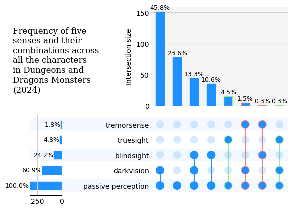 title_text = "Frequency of five senses and their combinations across all the characters in Dungeons and Dragons Monsters (2024)"