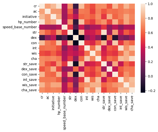 sns.heatmap(monsters.select_dtypes(include='number').corr())