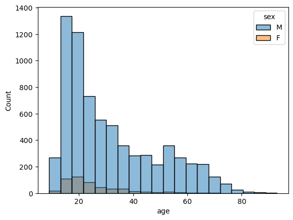 sns.histplot(data=df_sept_mod, x='age', bins=20, hue='sex')