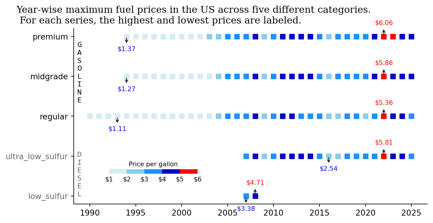 fig.suptitle('Year-wise maximum fuel prices in the US across five different categories. \n For each series, the highest and lowest prices are labeled.',x=0, ha='left', fontfamily='Serif')