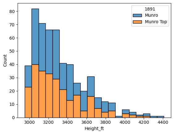 sns.histplot(scottish_munros, x='Height_ft', hue='1891', multiple='stack', bins=20)