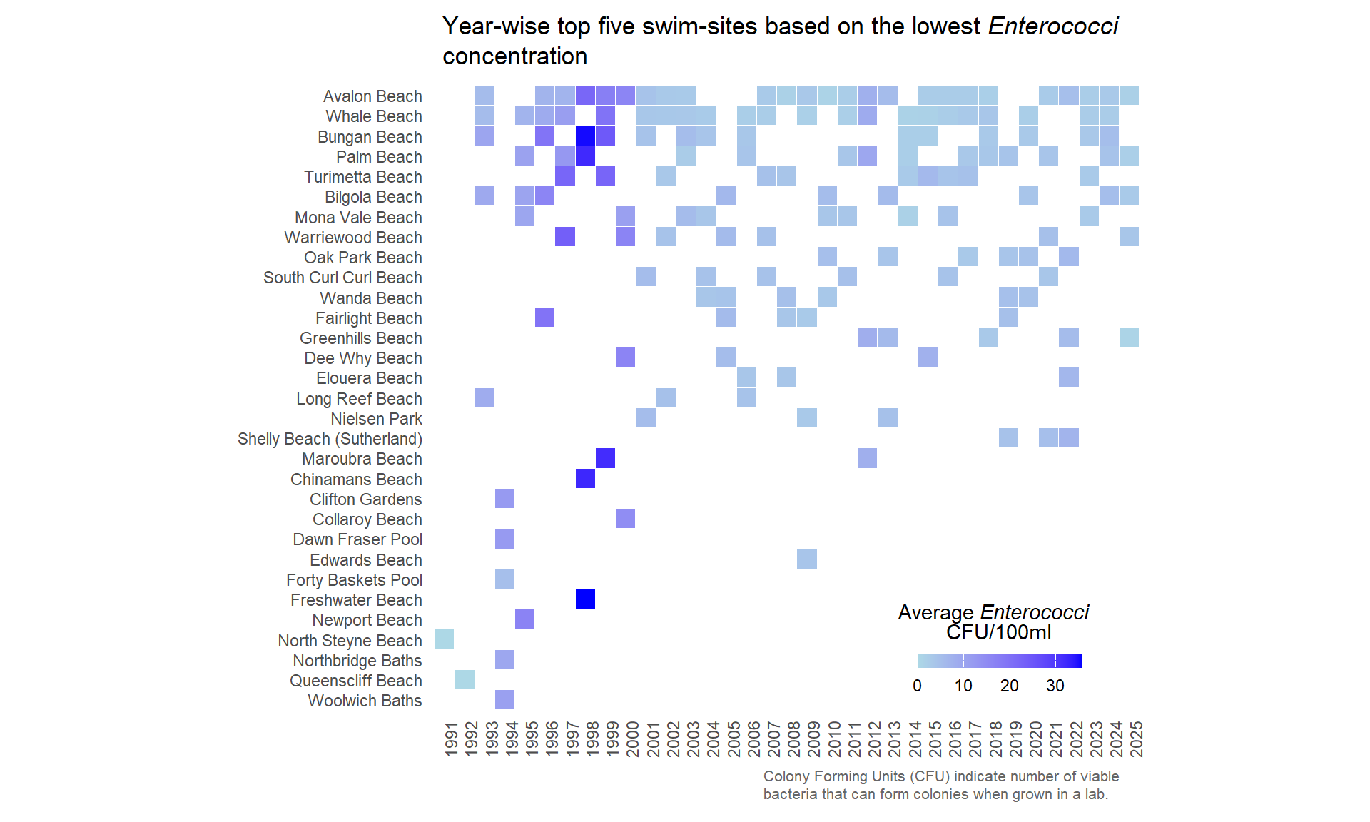 title = "Year-wise top five swim-sites based on the lowest *Enterococci* concentration",